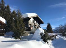 Das Chalet liegt etwas oberhalb vom Dorf in der Nähe eines kleinen Lärchenwaldes.
