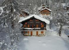 Das Chalet liegt etwas oberhalb vom Dorf in der Nähe eines kleinen Lärchenwaldes.